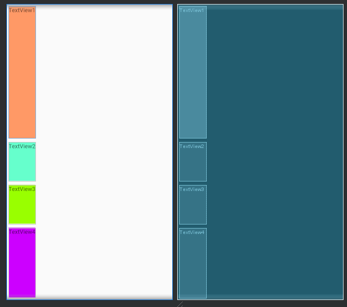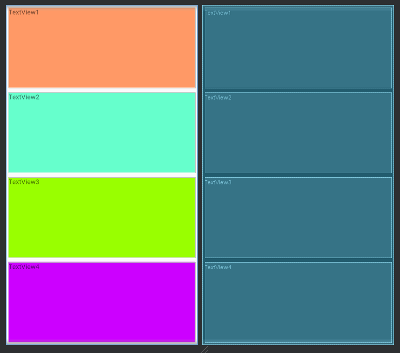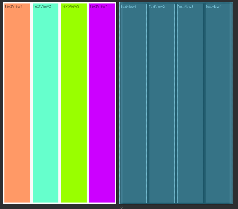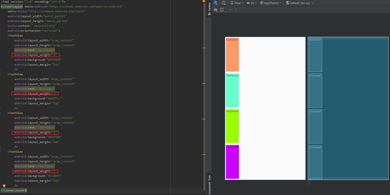 weight로 뷰마다 레이아웃에서 차지하는 비율을 정할 수 있습니다. 텍스트뷰 4개의 weight를 1로 설정하면 레이아웃에서 비율이 1:1:1:1로 지정이되고 weight를 다르게 주면 각 수치에 맞게 레이아웃에 비율대로 차지합니다.
