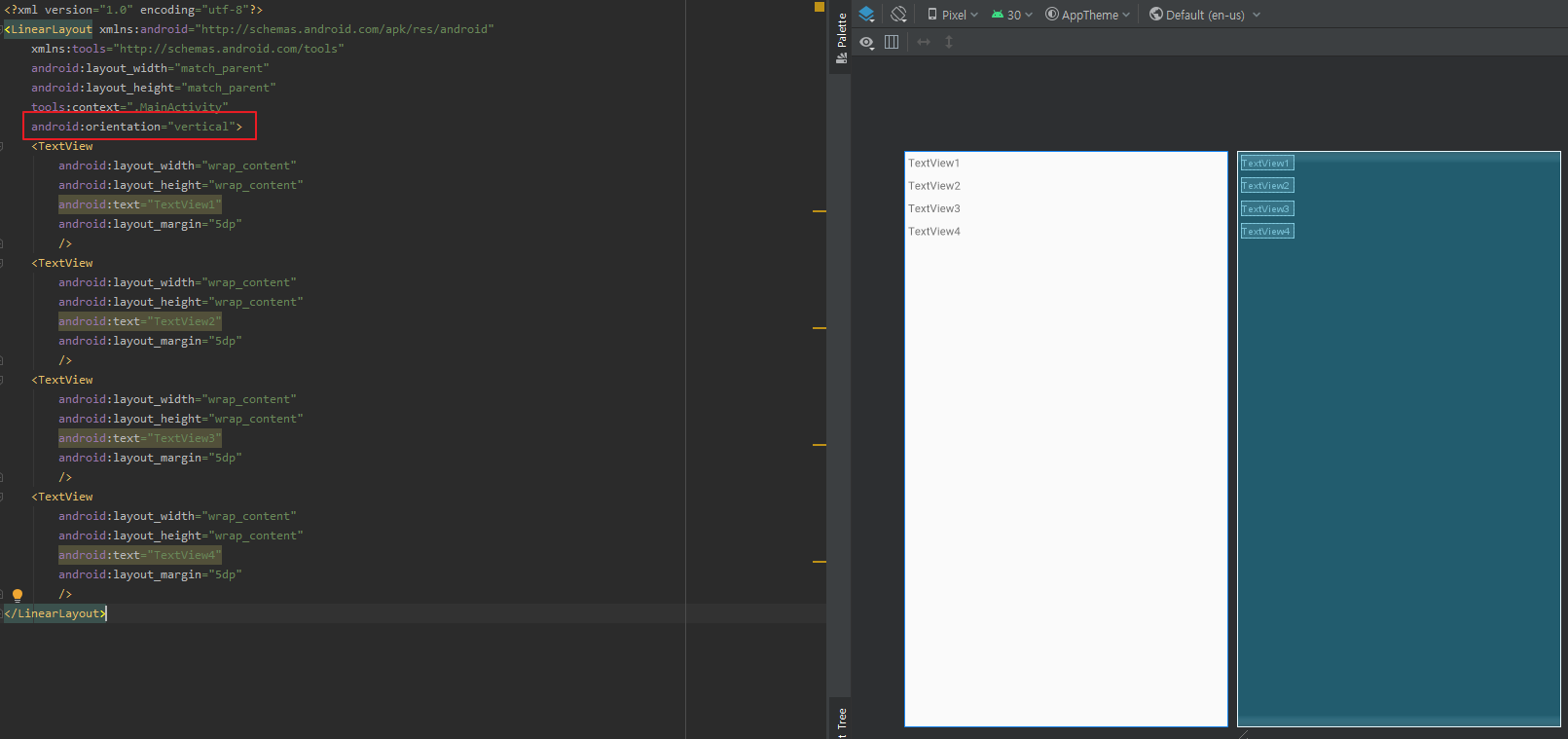 리니어 레이아웃 orientation속성을 vertical에 텍스트뷰 weight을 1로 했을 시