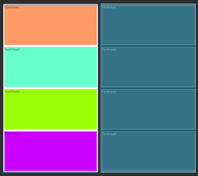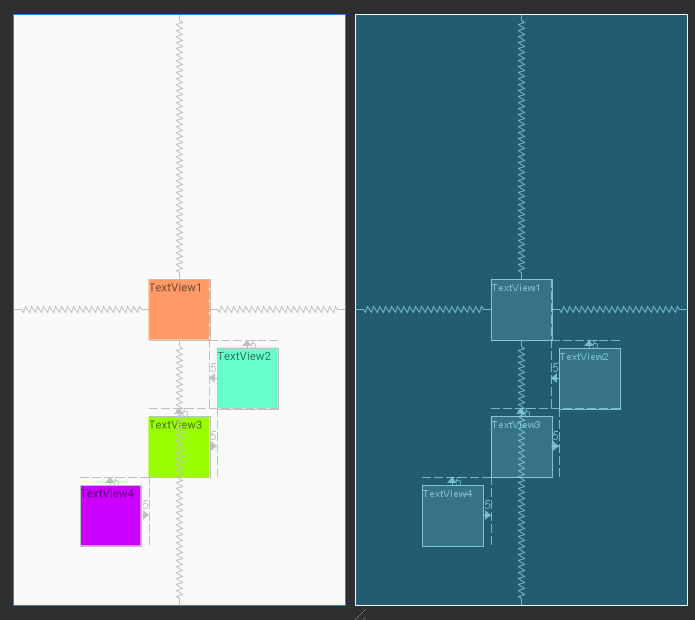 사진에서 보시다시피 TextView1은 부모의 중앙, TextView2는 TextView1의 오른쪽이자 밑, TextView3는 TextView2의 왼쪽이자 밑, TextView4는 TextView3의 왼쪽이자 밑으로 특정 뷰나 레이아웃의 상대적인(Relative) 위치에 배치 할 수 있습니다.