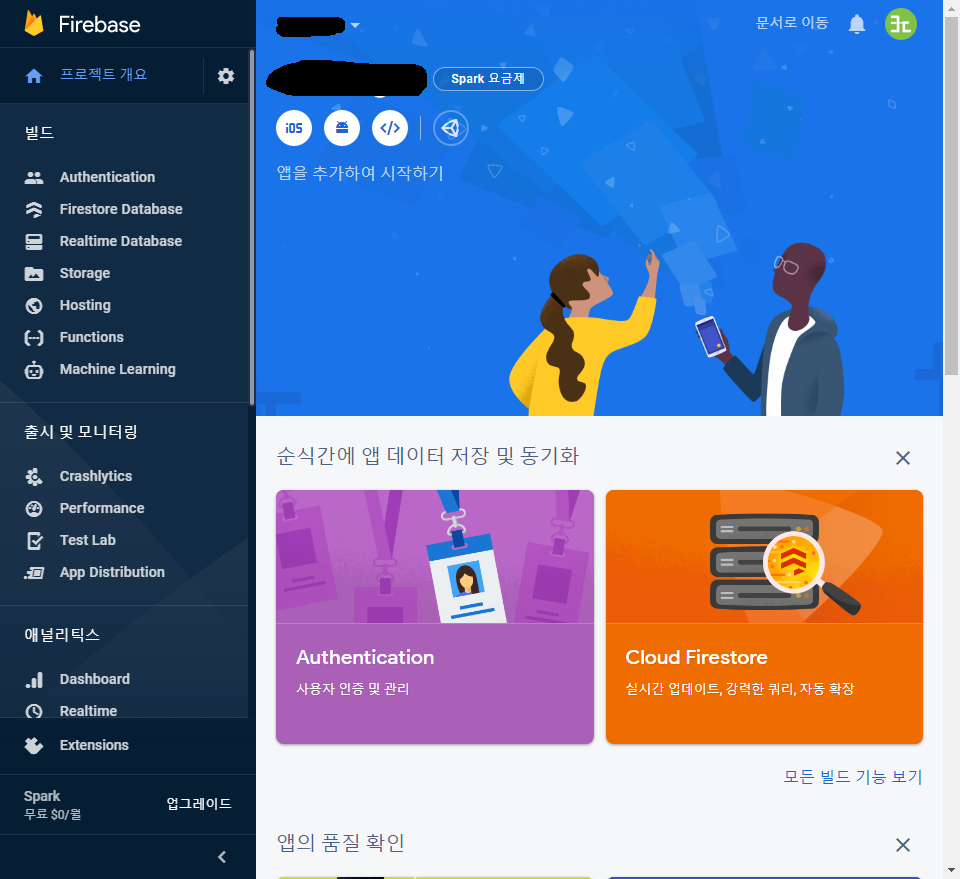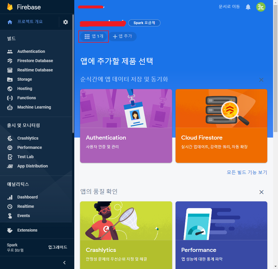 애널리틱스 까지 설정하게 되면 프로젝트가 생성됩니다. 프로젝트를 생성하였으니 앱과 연결하여 보겠습니다.