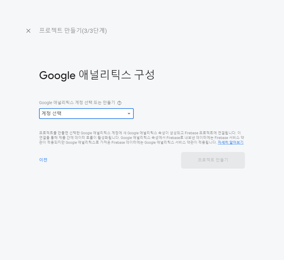 파이어베이스를 통해 앱과 애널리틱스를 연결 할 수 있습니다. 애널리틱스를 연결하면 앱의 사용자 수와 사용자의 특정 행동 및 패턴을 분석 할 수 있습니다. 이 설정은 필수 항목은 아니므로 애널리틱스 기능을 원하지 않는 다면 토글을 꺼주시길 바랍니다.