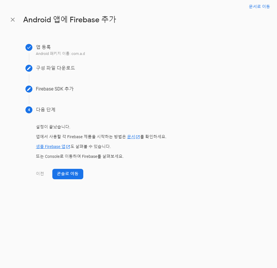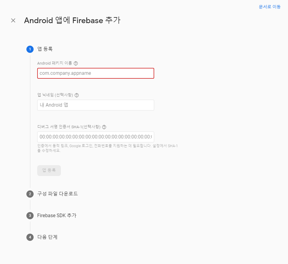 추가 될 앱의 패키지 명 및 닉네임, 인증서를 입력하여 줍니다. 패키지 이름은 필수로 적어주어야 합니다. 앱 닉네임은 콘솔에서 사용 할 이름이고 인증서는 파이어베이스의 지원을 위한 키입니다. 파이어베이스로 구글 인증 및 로그인 구현시 에러가 나온다면 인증서 때문인 경우가 많습니다. (로그인 및 인증 시 먹통이 되거나 앱이 종료됩니다.) 인증서는 나중에 등록하여도 되며 인증서 관련 문제는 https://codenet.tistory.com/31 에서 확인 부탁드립니다.