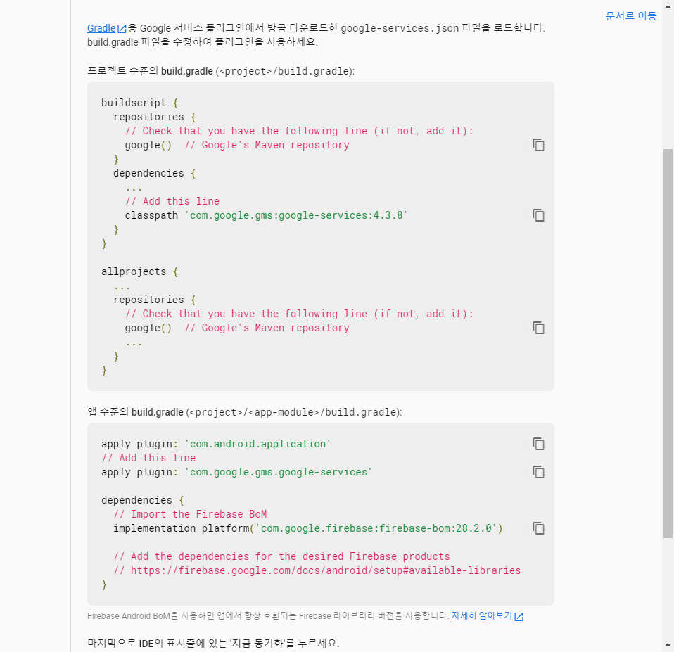 프로젝트 수준과 앱수준의 그래들에 플러그인을 추가하여 줍니다. 친절하게 설명이 나와있습니다. 코드를 추가하고 동기화해주면 파이어베이스를 사용 할 준비가 완료 되었습니다.
