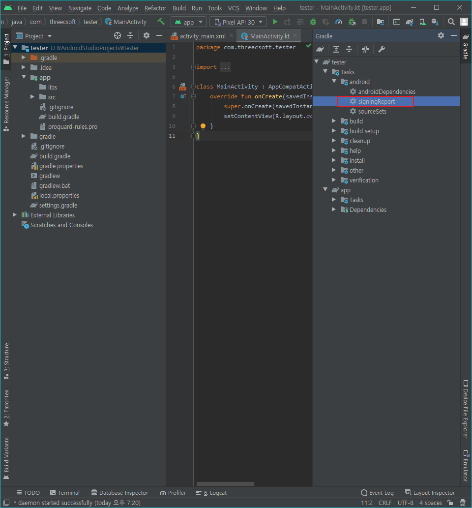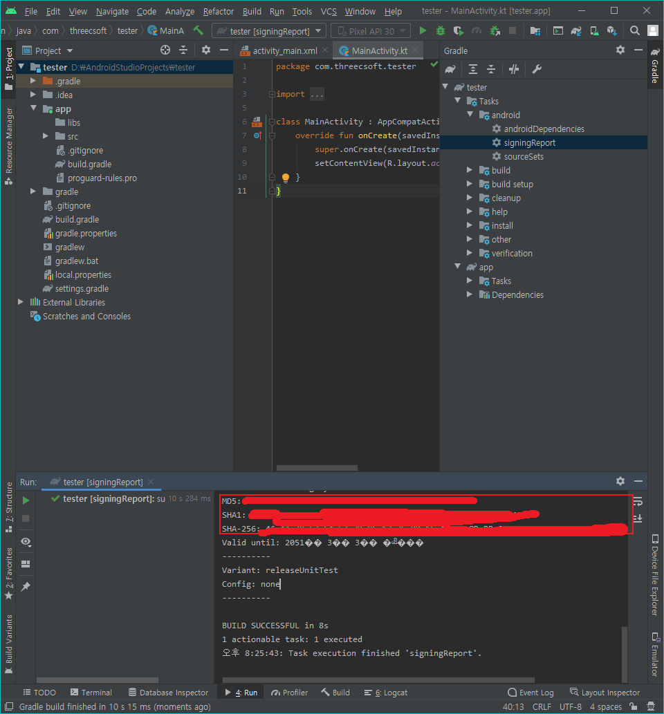 안드로이드 스튜디오에서 오른쪽의 그래들을 누르고 signingReport를 더블 클릭하여 실행 하여 줍니다.