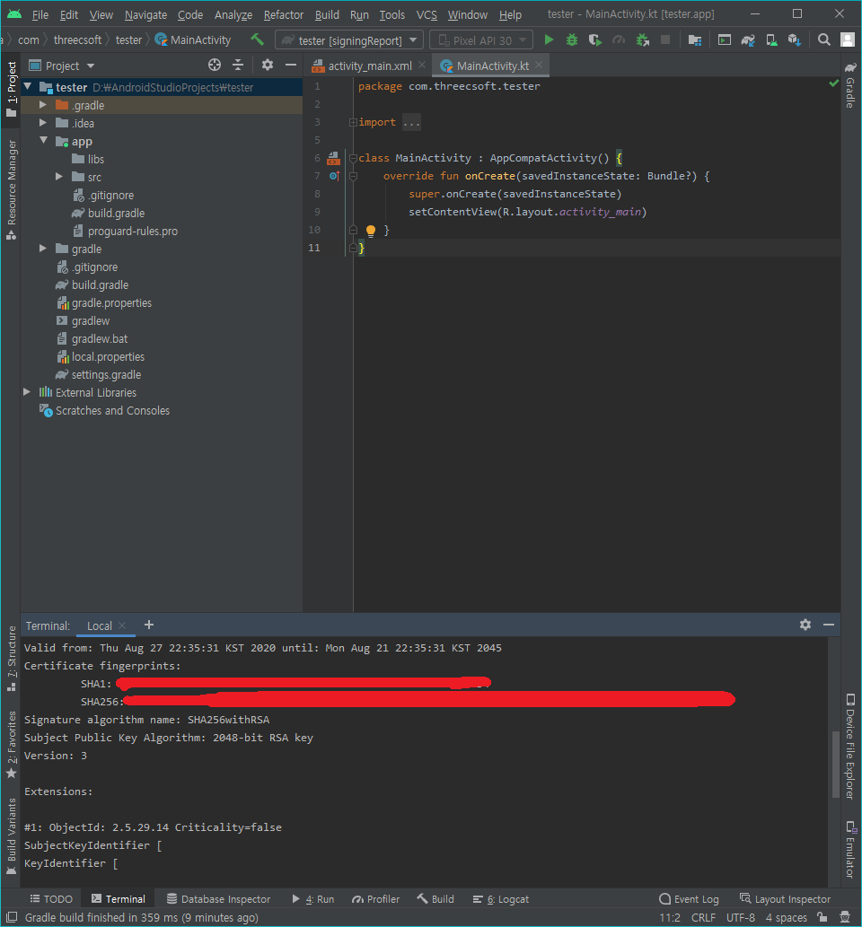 그러면 자동으로 SHA키를 보여 주는데 이게 바로 디버그 버전의 인증서입니다. 이 값을 파이어베이스 프로젝트에 추가하여 주면 디버그 인증서가 등록이 됩니다.