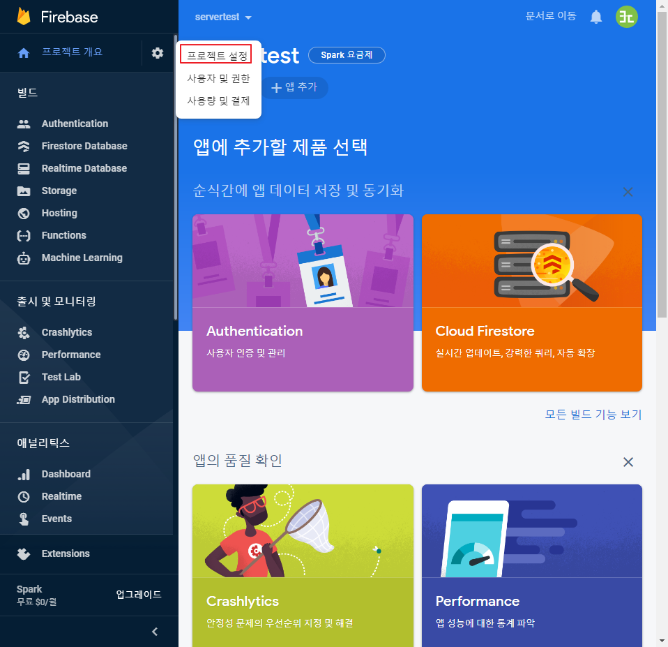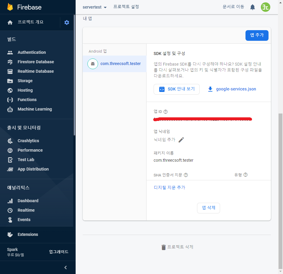 안드로이드 앱의 인증서는 디버그 버전과 릴리즈 버전이 따로 있습니다. 파이어베이스에 디버그 버전의 인증서만 있고 릴리즈 버전의 인증서를 등록하지 않았을 때, 가상 디바이스의 디버그 버전은 작동을 잘 하지만 릴리즈 버전은 작동을 하지 못합니다. 파이어베이스 프로젝트 개요 옆의 설정 버튼을 누르고 프로젝트 설정을 보면 등록된 앱과 인증서를 볼 수 있습니다.