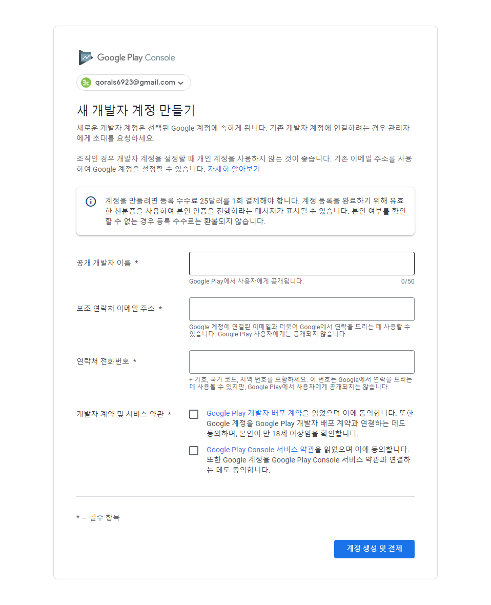 사용하고 있는 구글 계정으로 등록이 가능하며 구글 계정이 개발자 계정이 됩니다.