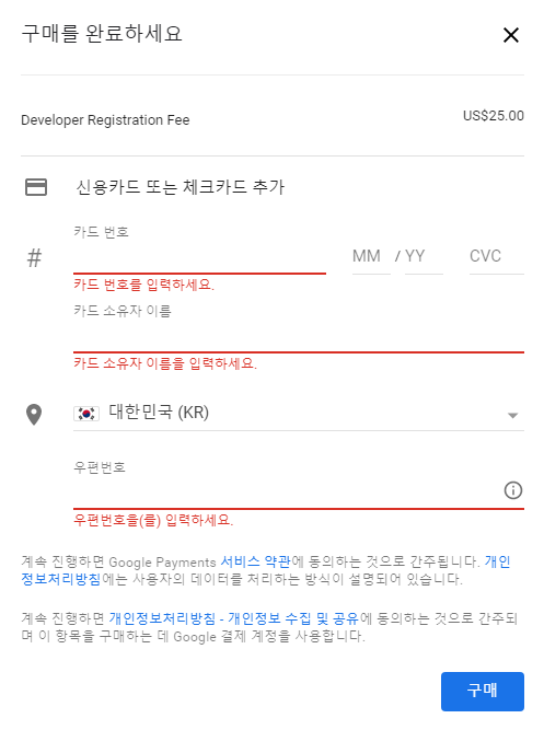 구글의 개발자 계정은 등록하는데 $25(25달러)가 필요하며 한번 등록하면 지속적으로 앱을 등록 할 수 있는 권한이 생깁니다. 매년마다 등록비를 줘야하는 A사의 등록비용보다는 상대적으로 매우 저렴합니다.