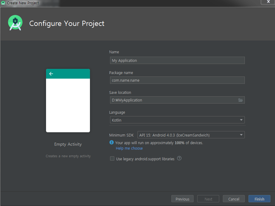 Language - 안드로이드 스튜디오에서 사용할 프로그래밍 언어를 정합니다.
